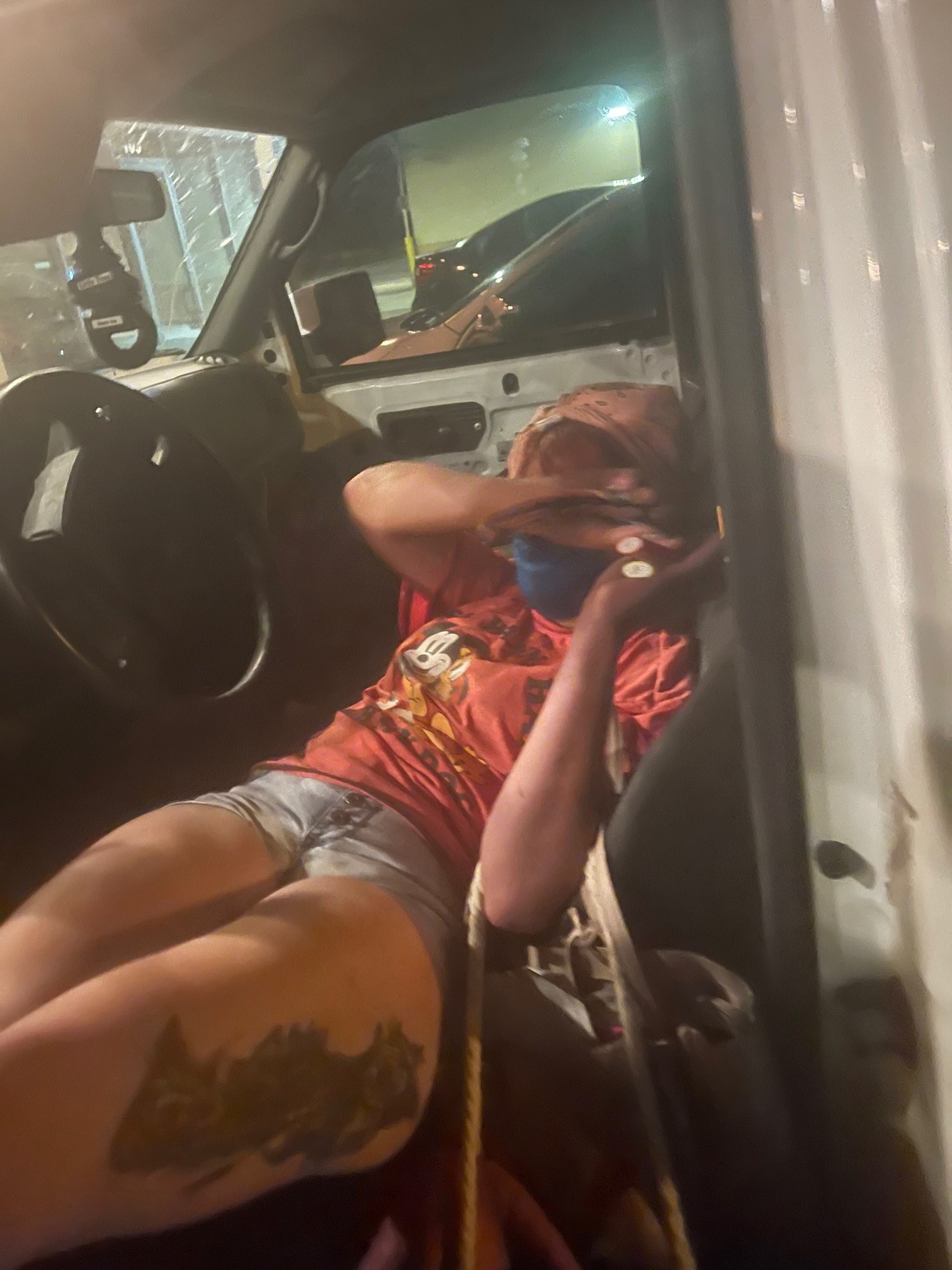 The woman in these photos was observed burglarizing a vehicle in the Hungry Howie's parking lot (108 Commonwealth Ave. N., Polk City). When the vehicle's owner confronted her, she fled. As you can see in one of the photos, she has a large tattoo on her left thigh.